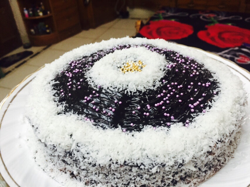 5. After combing the cake, garnish it with the shredded coconut powder.